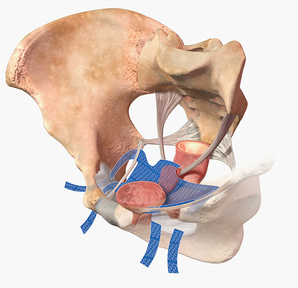 かつては開腹手術であったり、難易度の高い腹腔鏡手術であった仙骨膣固定術を、現在はロボット支援手術によって行うことができるようになりました。重症の骨盤臓器脱には、腹部に5つの孔を開けて腹腔鏡で膣の前方や後方にメッシュをつけて持ち上げるロボット支援腹腔鏡下仙骨膣固定術が推奨されます。